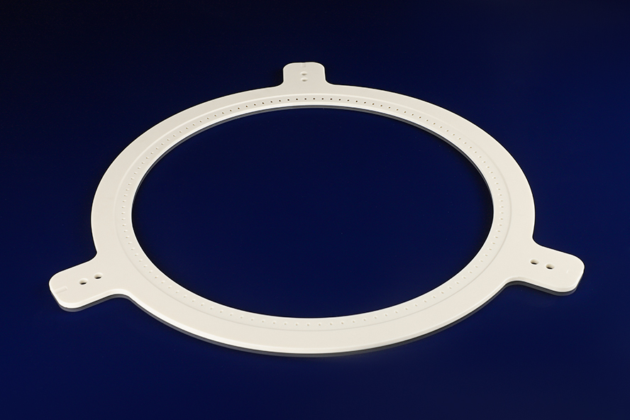斜孔結(jié)構(gòu)的氧化鋁環(huán)作為半導(dǎo)體制造中的關(guān)鍵零部件,憑借其獨特的材料特性與創(chuàng)新設(shè)計,在高精度、高潔凈度的芯片生產(chǎn)環(huán)境中發(fā)揮著不可替代的作用。其應(yīng)用價值主要體現(xiàn)在以下幾個方面: