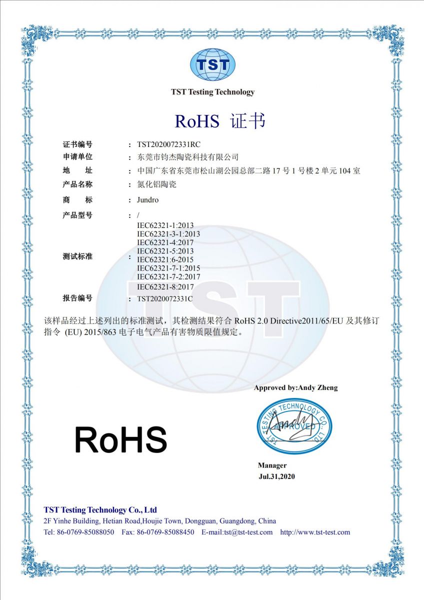 鈞杰陶瓷是專業(yè)的氮化鋁陶瓷廠家,我們從事各類高精密氮化鋁陶瓷結(jié)構(gòu)件加工,我們生產(chǎn)的氮化鋁陶瓷完全符合國家環(huán)保要求,并通過ROHS檢測。