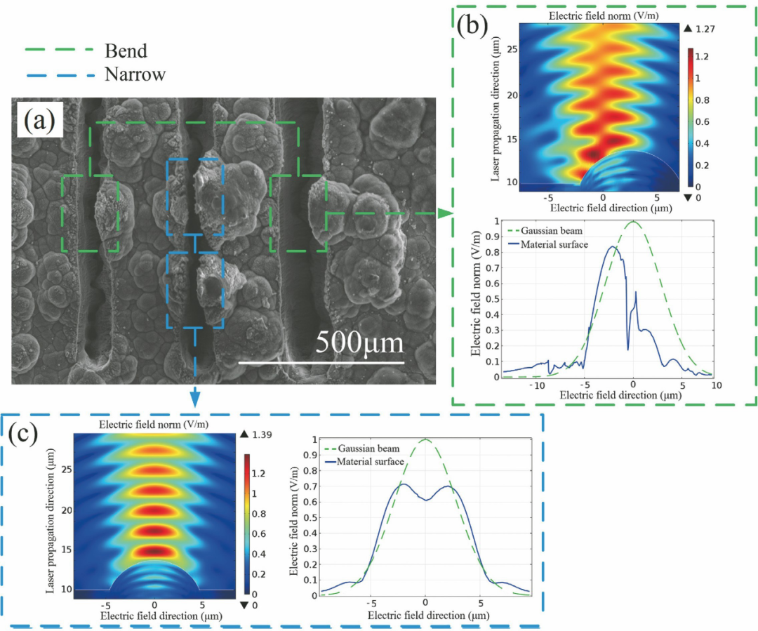 CMC-SiC主要由最外側(cè)的SiC層和內(nèi)部的SiC基體、纖維及界面層組成,在纖維編織結(jié)構(gòu)中還包含許多微小孔隙,復(fù)雜的材料結(jié)構(gòu)致使CMC-SiC在激光加工過程中會產(chǎn)生與一般均質(zhì)材料不同的物理和化學(xué)變化。在纖維增強復(fù)合材料與激光相互作用機理方面,國內(nèi)外學(xué)者基于理論與實驗進行了大量探索。吳恩啟等理論研究了碳纖維增強復(fù)合材料的熱傳導(dǎo)規(guī)律,推導(dǎo)出了復(fù)合材料內(nèi)部纖維束平面內(nèi)熱擴散系數(shù)與相位梯度的關(guān)系。纖維編織復(fù)合材料具有各向異性的特點,纖維束方向會直接影響熱傳導(dǎo)規(guī)律,且復(fù)合材料的熱擴散系數(shù)與編織方式和基體材料分布相關(guān)。Allheily等研究了高能量激光對碳纖維增強復(fù)合材料的燒蝕機制,發(fā)現(xiàn)碳纖維增強復(fù)合材料對激光輻照產(chǎn)生的熱量具有很強的隔絕作用,主要原因在于碳纖維能夠承載并吸收熱量,層間基體材料的燒蝕可以有效降低激光能量的積累。Zhai等使用波動光學(xué)仿真軟件分析了C/SiC原始表面粗糙度對激光加工效果的影響,仿真結(jié)果表明C/SiC原始表面形貌對激光刻蝕效果有顯著影響,激光輻照在C/SiC表面凸起的不同位置時,電場會發(fā)生偏移或減弱,電場強度的不均勻分布導(dǎo)致C/SiC表面不同區(qū)域的刻蝕形貌存在差異,如圖2所示。