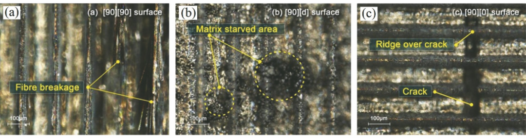 CMC-SiC由多層纖維編織而成,在激光加工中會產(chǎn)生與一般均質(zhì)材料不同的缺陷。Wu等利用脈沖激光對C/SiC進行了沿垂直纖維、平行纖維、纖維中軸三種掃描方向的加工實驗,在加工參數(shù)相同的前提下,掃描方向不同得到的微結(jié)構(gòu)形貌尺寸不同,并且在微結(jié)構(gòu)中發(fā)現(xiàn)了纖維斷裂、基體缺失及微裂紋等加工缺陷,如圖6所示。Hejjaji等在碳纖維增強復(fù)合材料的激光打孔過程中也發(fā)現(xiàn)了明顯的基體缺失,造成這種現(xiàn)象的原因是碳纖維具有較高的熱傳導(dǎo)率,在激光輻照過程中材料吸收的熱量沿纖維傳導(dǎo)至基體材料,大量的熱吸收導(dǎo)致基體材料被燒蝕。同時,加工區(qū)域邊緣基體材料缺失導(dǎo)致的纖維外露現(xiàn)象尤為明顯。
