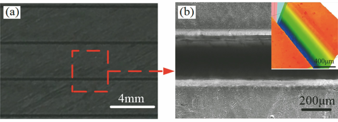 圖8 SiC/SiC的飛秒激光加工效果:(a)加工區(qū)域;(b)局部放大圖