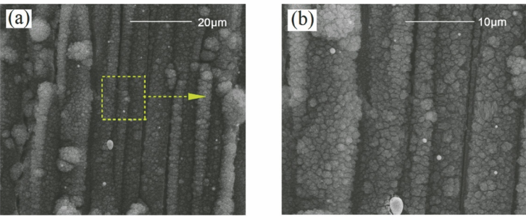 為了控制CMC-SiC中由激光熱作用導(dǎo)致的加工缺陷利用超短脈沖激光對CMC-SiC 進行精密加工成為國內(nèi)外學(xué)者研究的熱點。蔡敏等對比了納秒激光和皮秒激光的SiC/SiC加工效果,結(jié)果表明:納秒激光加工過程中材料表面同樣存在熱影響區(qū),導(dǎo)致激光輻照區(qū)域產(chǎn)生了重鑄層、分層及微裂紋等缺陷;利用皮秒激光加工,相對納秒激光,SiC/SiC的加工質(zhì)量有顯著提高,激光輻照區(qū)域未發(fā)現(xiàn)熱影響區(qū),即重鑄層、分層、微裂紋等缺陷在皮秒激光加工中得到了有效抑制。Liu等利用皮秒激光開展了C/SiC的微孔加工實驗,研究發(fā)現(xiàn):當(dāng)激光功率密度較低時,孔內(nèi)形成的反沖氣壓同樣較低,導(dǎo)致孔內(nèi)碎屑不能有效噴出;升高激光功率密度后,加工過程中孔內(nèi)產(chǎn)生強烈的沖擊波,形成的反沖高壓使得碎屑從孔內(nèi)高速向外噴射,微孔加工質(zhì)量明顯提高。Moreno等開展了飛秒激光加工纖維增強復(fù)合材料的實驗研究,發(fā)現(xiàn)內(nèi)部基體材料的尺寸和形狀對激光加工質(zhì)量存在較大影響。在飛秒激光參數(shù)的合理調(diào)控下,纖維增強復(fù)合材料獲得了良好的加工質(zhì)量。Zhai等在SiC/SiC上利用飛秒激光進行了多種微結(jié)構(gòu)的制備研究,檢測報告顯示SiC/SiC加工區(qū)域輪廓清晰,沒有出現(xiàn)機械加工常見的崩邊、纖維拔出,以及長脈沖激光加工中明顯的熱影響區(qū)。為了驗證加工效果,利用飛秒激光在SiC/SiC表面制備了大面積的微槽結(jié)構(gòu),加工效果如圖8所示。